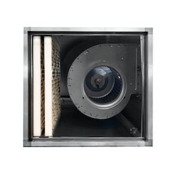 Filterkast voorzien van 6000m3/h centrifugaal ventilator en doosfilters.