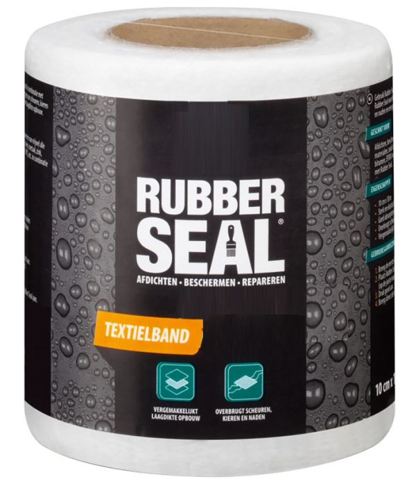 Rubber seal textielband is te gebruiken i.c.m. Rubber seal reparatiepasta en dient ter ondersteuning om om scheuren, kieren en naden te overbruggen. Gebruik een kwast om de pasta aan te brengen. Na de eerste laag het textielband aanbrengen, hierna nogmaals een laag rubber seal tot het textielban goed is afgedekt. Hiermee ontstaat een stevige afdichting welke bestand is tegen werking van de af te dichten materialen.