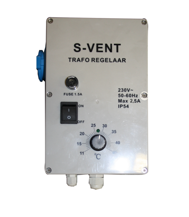Technische gegevens: •Plug & Play •Voorzien van 2.5A zekering •Losse thermostaat voeler •Aansluitspanning: 230V / 50-60Hz •Ampère: max 2.5A •IP54 behuizing Deze S-vent trafo controller van 1,5 ampère is o.a. te gebruiken voor de aansturing van de S-vent box en- of ventilatoren met een luchtcapaciteit van 250m3, 500m3 en 2500m3, maar kan ook gebruikt worden op alle S-vent in-line buisventilatoren. De bediening van de S-vent Trafo Controller 1,5 ampère is zeer eenvoudig: U hoeft alleen de gewenste temperatuur in te stellen en de schakelaar op "on" te zetten. De regelaar doet verder de rest