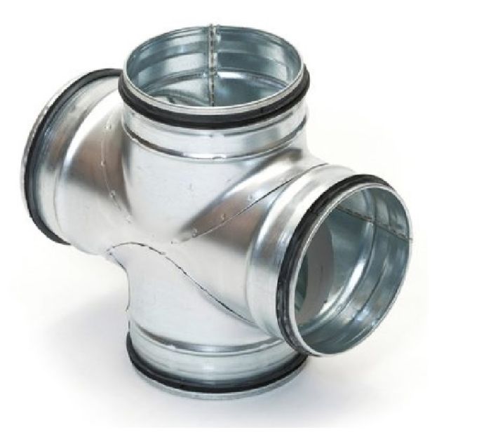 Maatvoering: spirobuizen worden op binnendiameter gemeten. Hulpstukken zoals dit kruisstuk zijn aan de buitenzijde iets kleiner, zodat ze eenvoudig in de spirobuis schuiven. Dit model is geschikt voor een hoofdkanaal van Ø800mm en is voorzien van twee aftakkingen van eveneens Ø800mm.