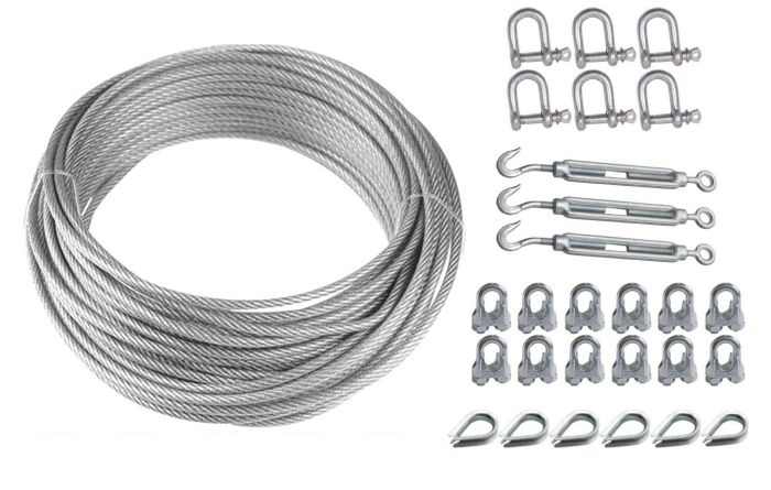 Set bestaat uit : 12 x draadklem 3mm verzinkt 1 x rol 20m 3mm verzinkt staalkabel 6 x kous 3mm verzinkt 3 x draadspanner m6 haak oog gegalvaniseerd 6 x harpsluting 5mm verzinkt Tui kabel set 3mm Verzinkt is ideaal voor het ondersteunen van verlengde of onstabiele luchtkanalen, uitblaaskanalen. Alle materialen zijn vervaardigd uit gegalvaniseerde staalkabel en de set bevat voldoende onderdelen om 3 x 6,5 m lange tuikabels te maken. De staalkabel zelf is vervaardigd uit verzinkte staalkabel met een diameter van 3 mm en bestaat uit 6 gedraaide sets van 12 draden, waardoor het ideaal is voor het spannen/afspannen van draden. 024-20 22 197